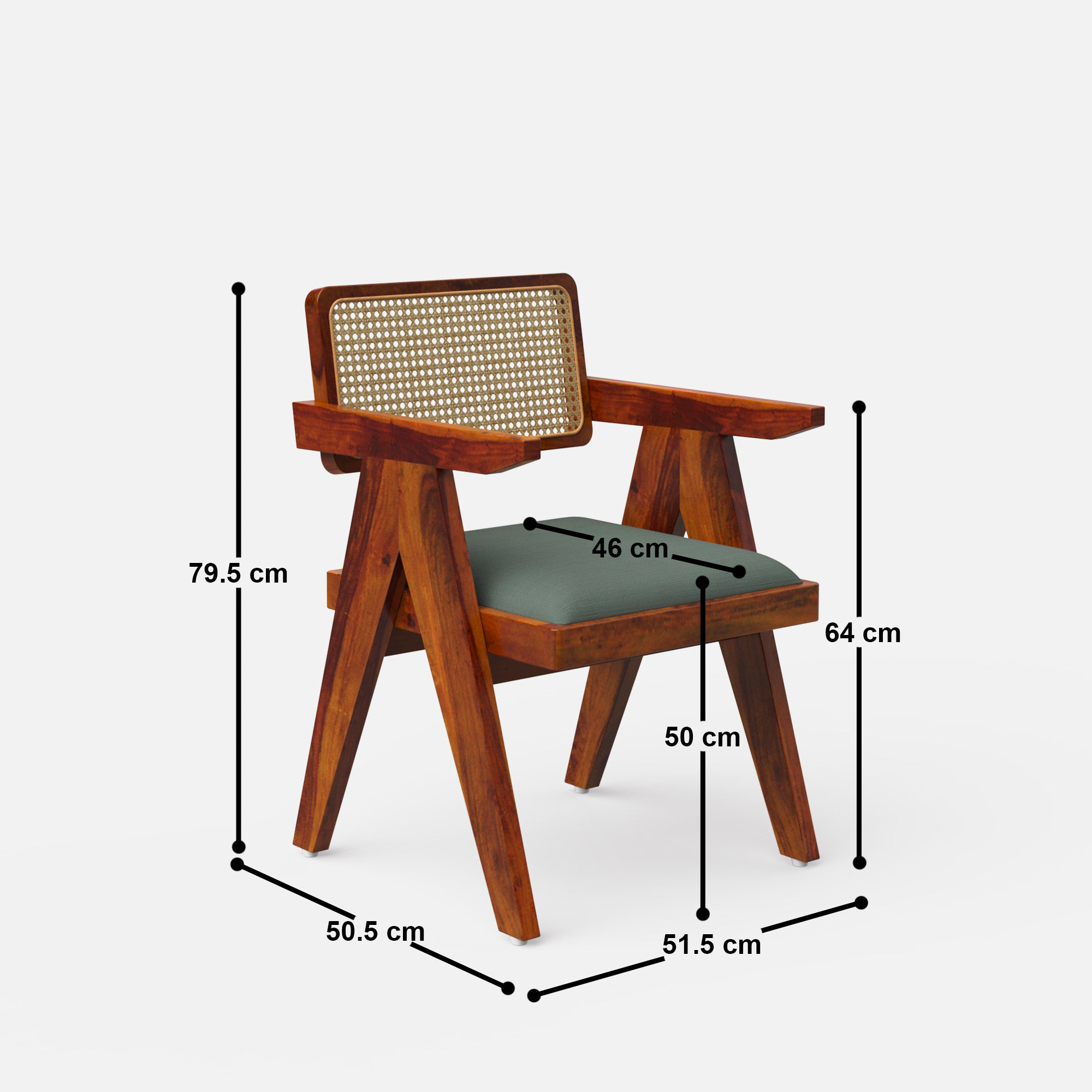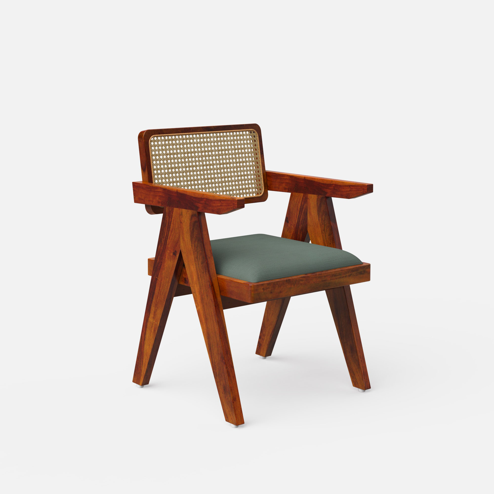 The "Luis-Pierre Dining Table Set" offers a perfect blend of elegance and comfort. The Luis Table features a round design with a sturdy pedestal leg crafted from Sheesham wood in a honey finish. Paired with Pierre Jeanneret-inspired chairs, also in honey-finished Sheesham, the set includes upholstered seats in Slate Grey 100% Cotton fabric for a cosy dining experience. Available in multiple wood finishes and fabric colours, this handcrafted set provides soft foaming and comfortable seating.