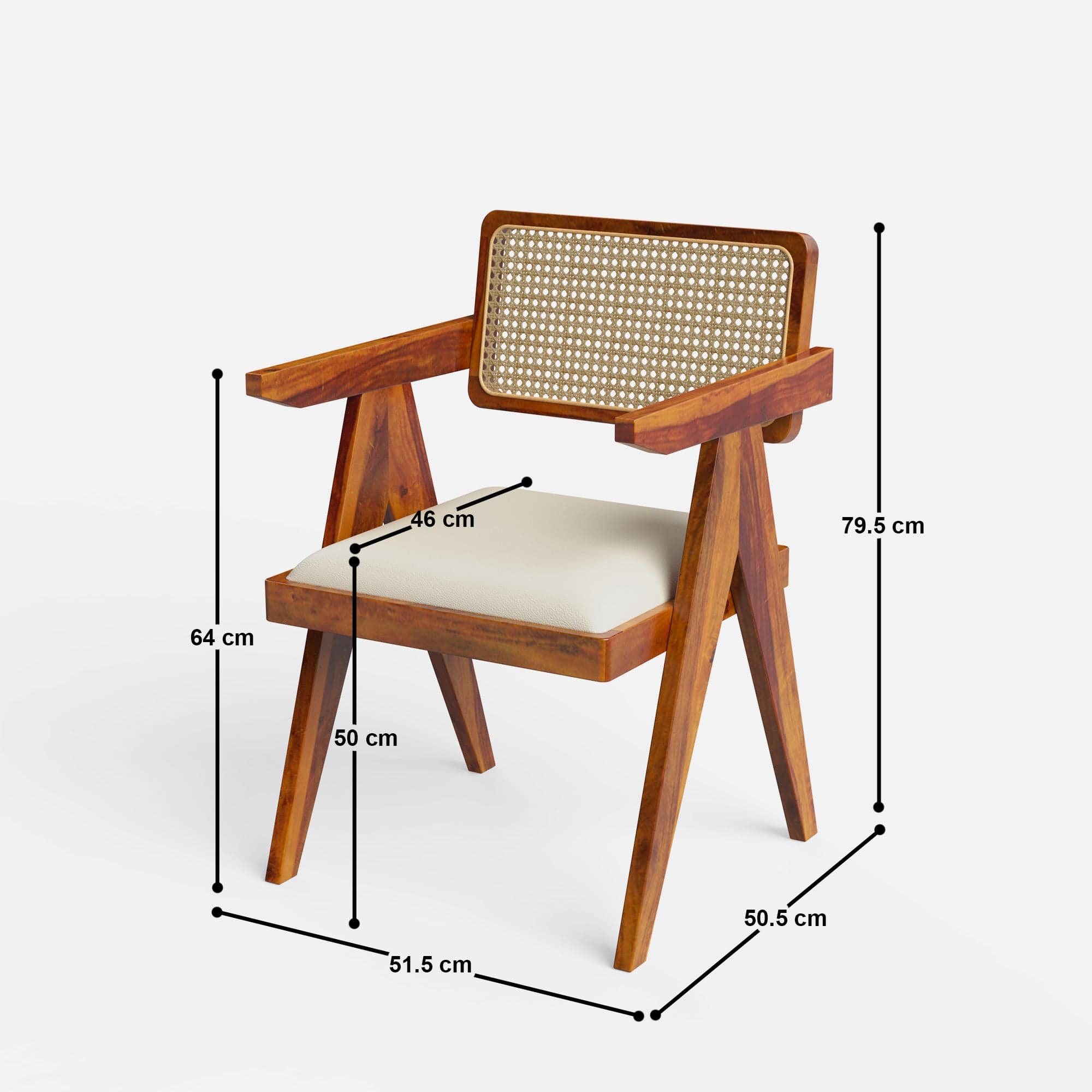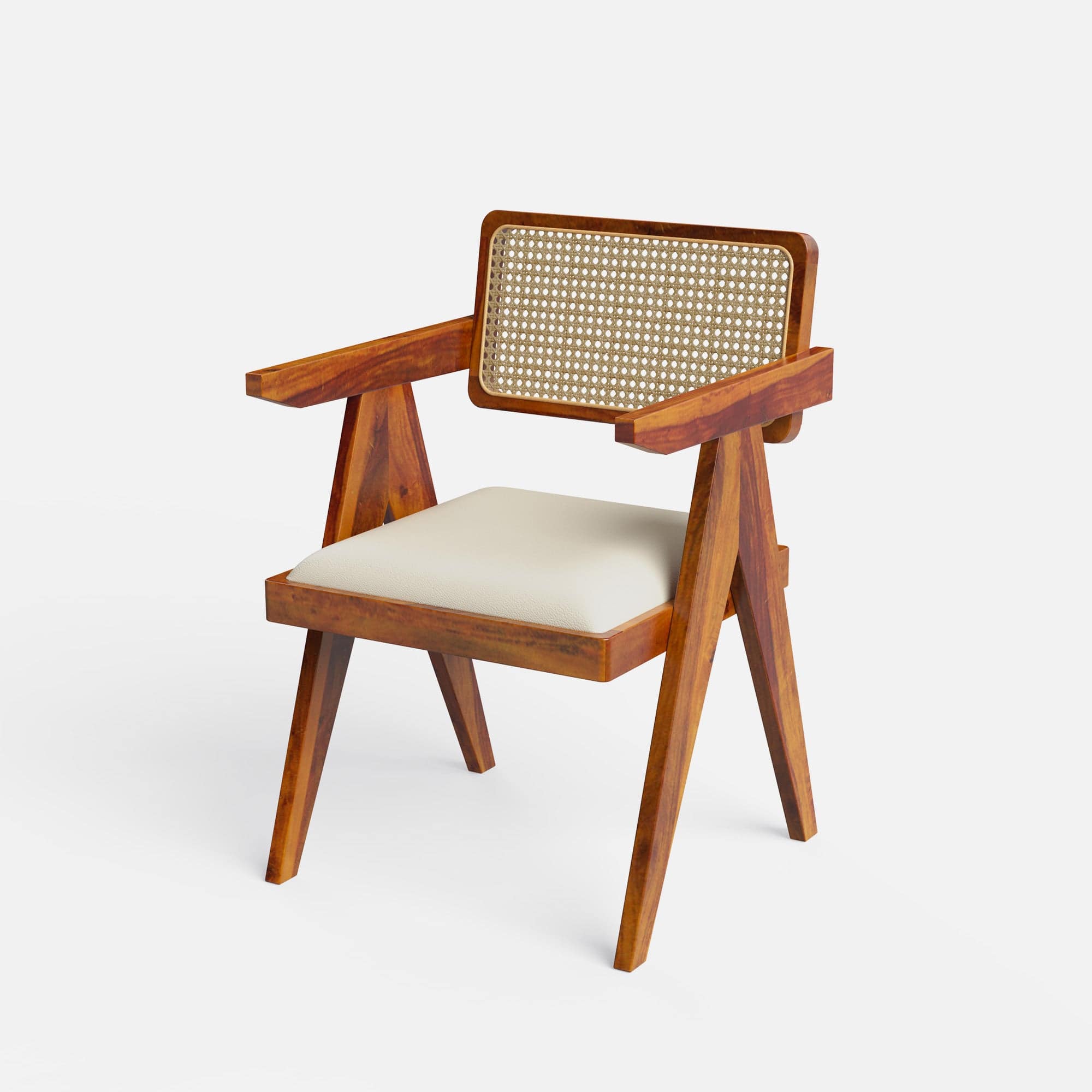 A captivating solid wood dining table set with Pierre chairs that effortlessly blends farmhouse charm and classic design elements. The Gable table is crafted from mango wood with a natural polish, highlighting the wood's unique grain patterns. Inspired by classic monastery table design, it exudes a rustic elegance perfect for farmhouse or barn-style interiors. The Pierre chairs feature a timeless Pierre Jeanerette design, crafted from sheesham wood with a Honey finish. The seats are luxuriously upholstered in Ivory colored faux leather with soft cushioning, while the backrests showcase a natural rattan cane weave, adding a touch of texture and sophistication.
