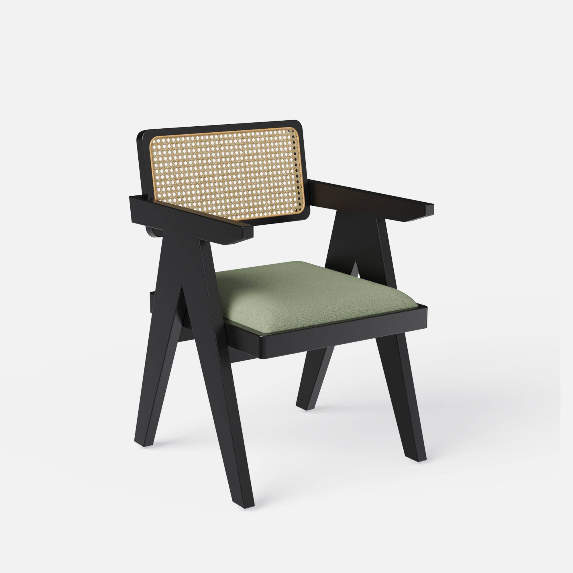 Introducing the Roma-Pierre luxury dining table set, a blend of contemporary modern aesthetics and enduring craftsmanship. Available in three sizes: 100 cm, 150 cm, and 175 cm, the table is expertly crafted from Sheesham wood with a natural polish, showcasing its intrinsic beauty. The robust block legs ensure durability and stability. Accompanying this elegant table are the Pierre chairs, featuring classic Pierre Jeanerette design elements. Crafted from Sheesham wood with a matte black finish, the chairs offer a comfortable dining experience with seaweed green cotton blend fabric upholstery and a natural rattan cane weave backrest.