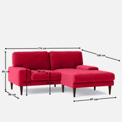 The Merlin L Shaped Sofa - 68.5" is a curvy, premium addition to any modern living space. Its wide arm design and wooden legs with golden ferrules exude a sleek Scandinavian charm. Upholstered in plush Sangria Red Velvet Fabric, the sofa offers spacious seating with a soft and comfortable build. Perfect for lounging or entertaining, this handcrafted masterpiece is available in multiple fabric colors, ensuring a perfect fit for your interior style.